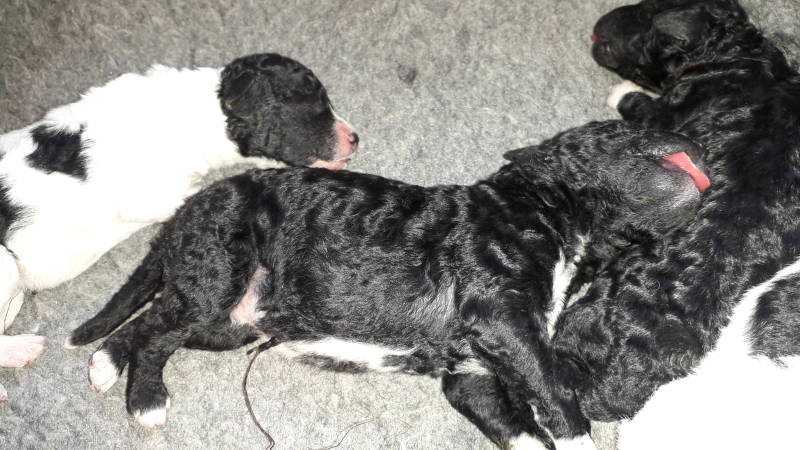 De eerste pup is een zwart/wit teefje. Geboren om 14.09 uur.