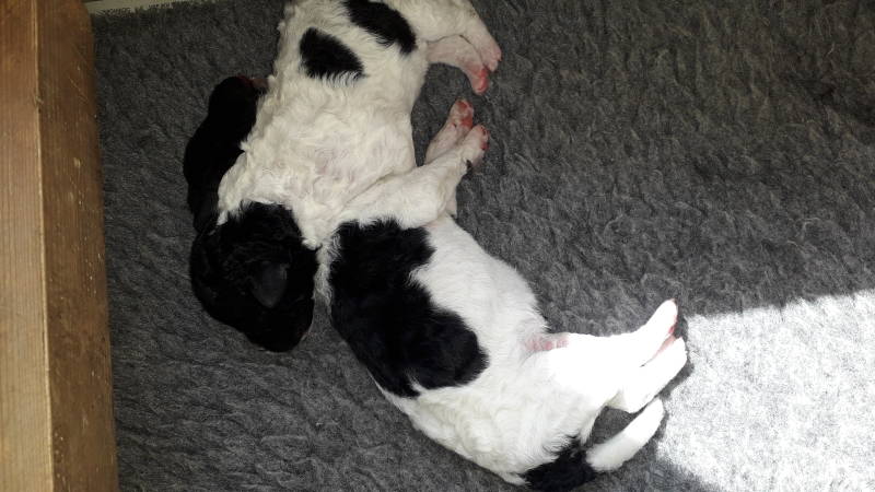 De achtste pup is een zwart/wit reutje met kleine vlekjes. Geboren om 17.09 uur.