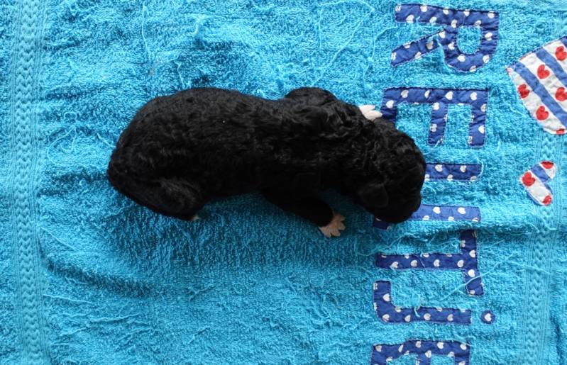 De zevende pup is een zwart reutje met een klein wit puntje op de staart.