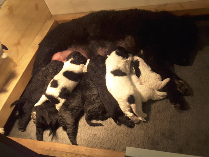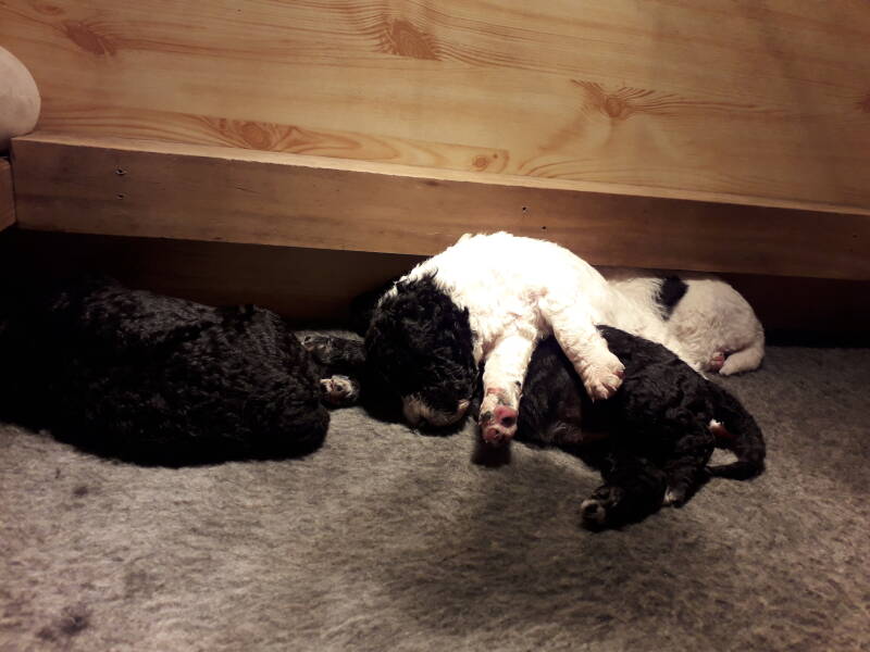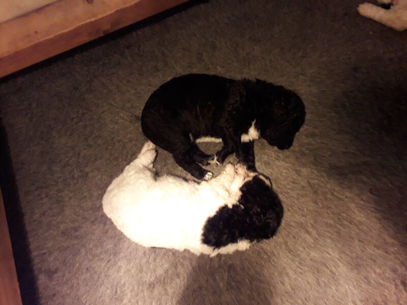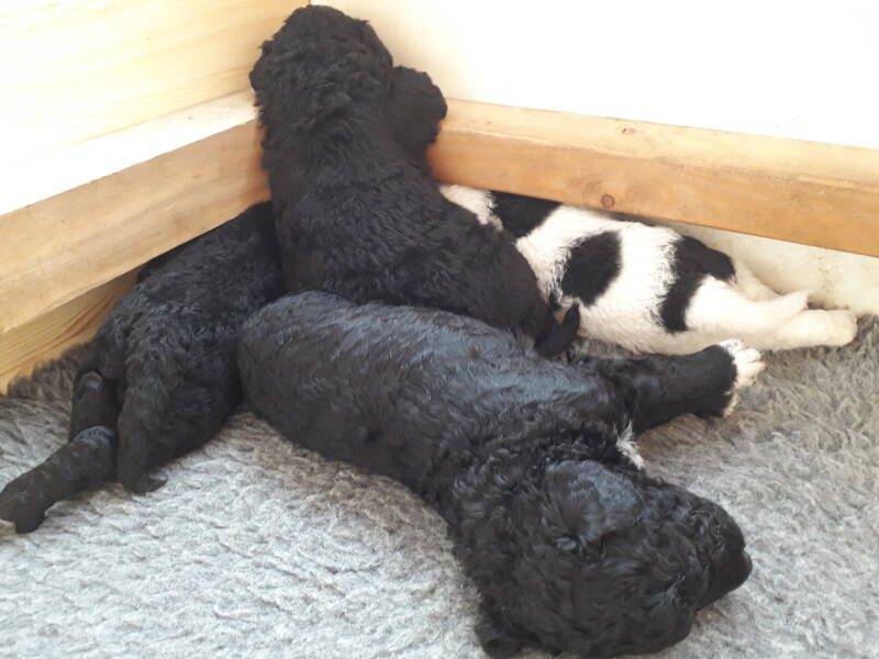 De pups zijn alweer 3 weken. Ze doen het supergoed. Ze lopen al aardig wat rond in de werpkist en ze beginnen ook al te waken. Als je zachtjes tegen de werpkist tikt gaan bij sommigen de kopjes omhoog en wordt er al aardig wat geblaft. Ze beginnen ook al met elkaar te spelen, zoals je hieronder op het filmpje ziet.