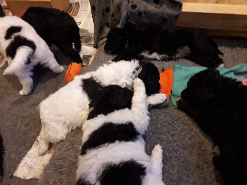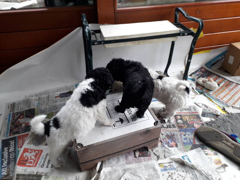De boefjes zijn alweer 5 weken en het zijn al "echte" hondjes. Ze spelen, stoeien en vechten met elkaar. Ze krijgen ook veel bezoek en dat vinden ze helemaal leuk. Ze krijgen 4x per dag vers vlees want moeder Vrouke is aan het afbouwen. Ze voedt nog wel, maar als er 9 pups tegelijk aan komen stormen wordt het voeden wel minder. Het zijn vaak een paar korte voedmomentjes per dag. Ze krijgen nu ook af en toe een pensstaafje om te kauwen. Dat hebben ze al snel door en vinden het lekker.