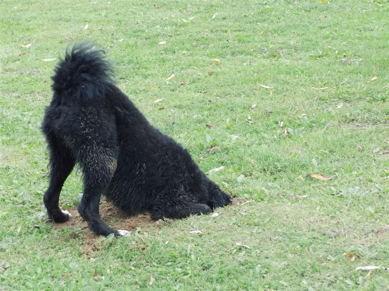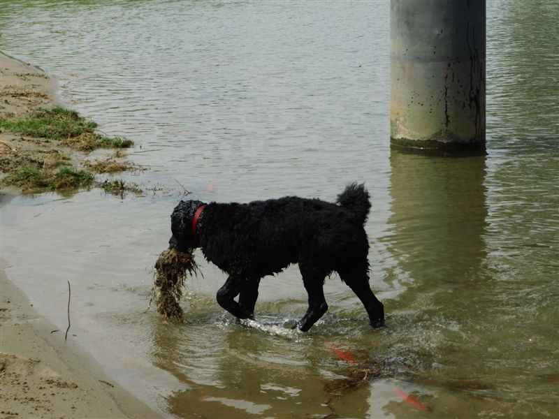 Tijdens haar eerste zomer zijn we intensief gaan oefenen met zwemmen. Onze andere twee wetterhounen hebben nooit graag gezwommen, dus wilde we daar verandering in brengen. Vrouke zwemt nog steeds niet voor haar plezier, maar het gaat steeds beter, vooral als er iets lekkers in het water wordt gegooid. Deze keer een stuk hout. waaraan we een pensstaafje hebben vastgemaakt.