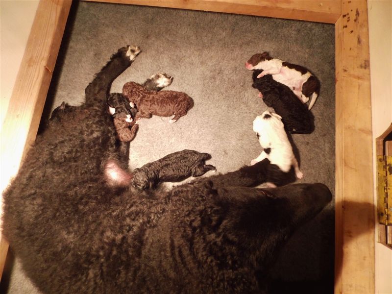 En de laatste pup, nummer 7, is geboren om 12:45, een bruin bonte reu.