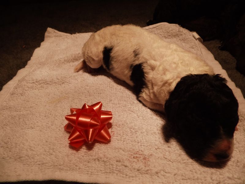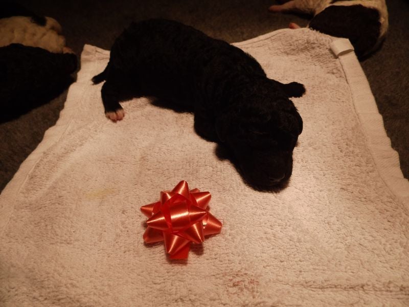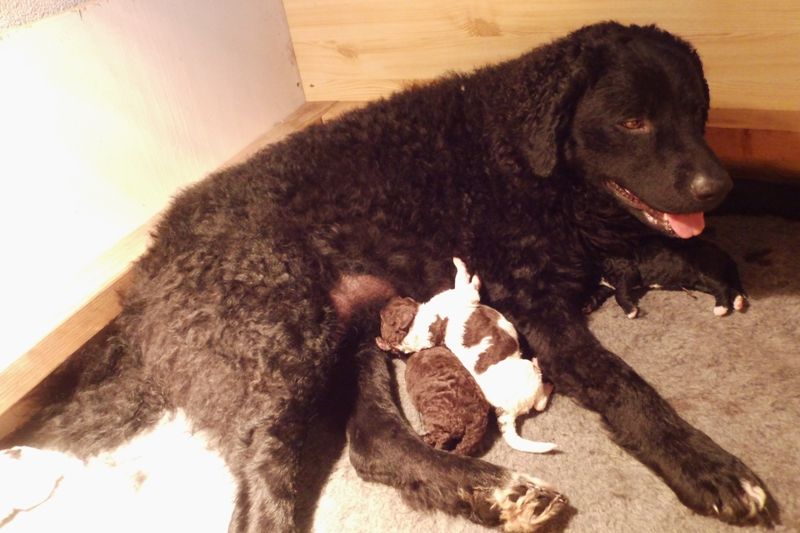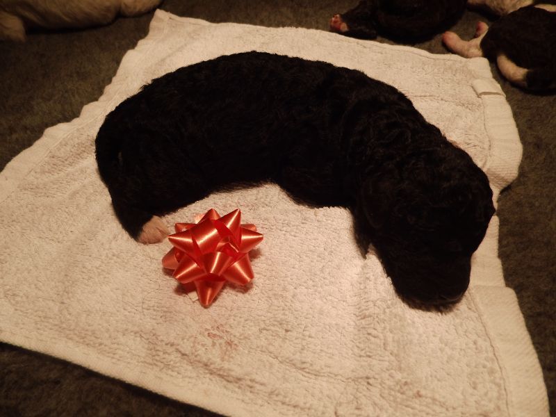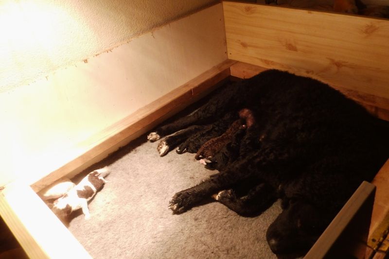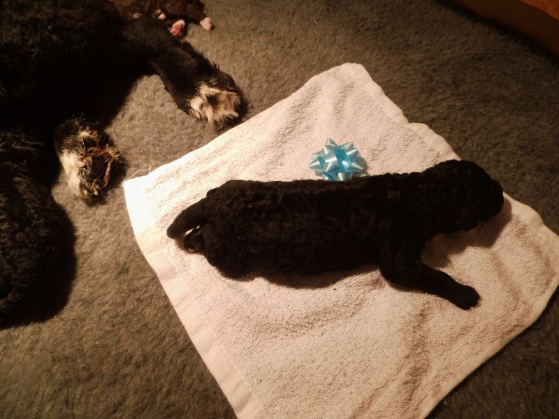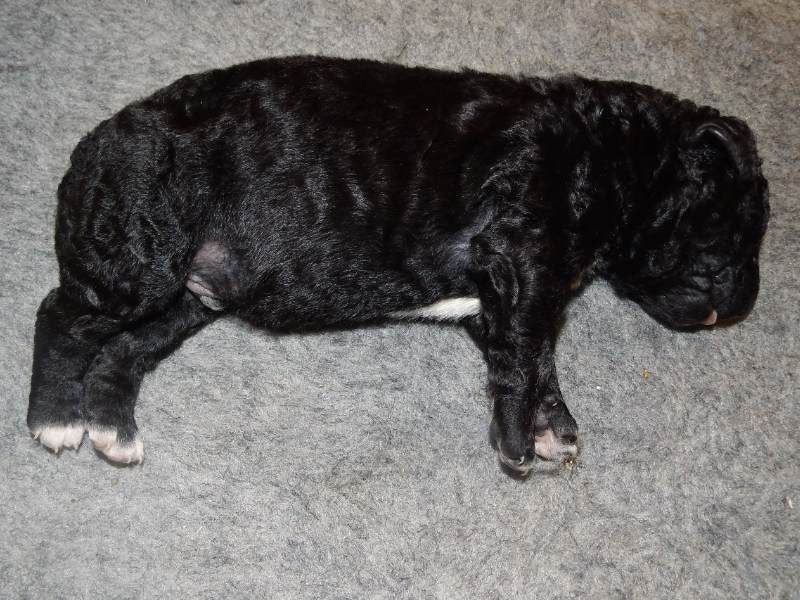 Dit is de eerste pup, geboren om 05:30. Een zwart teefje.