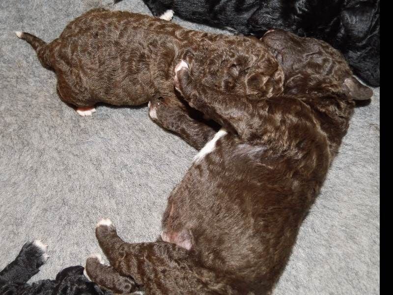 Alle bruine en zwarte pups hebben witte pootjes en een witte bes.